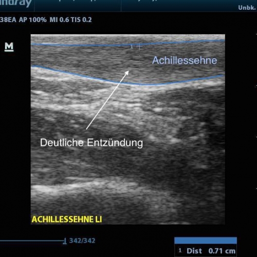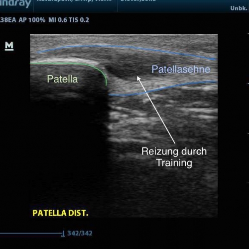 Je nach Intension der Untersuchung werden hier Schallfrequenzen zwischen 3 und 12 Mhz eingesetzt. Je niedriger die Frequenz, desto besser ist die Penetration der Wellen durch das Gewebe, allerdings lässt dabei die Detailreiche nach. Das heißt, die Schallwellen dringen tiefer ein, aber das Bild wird unschärfer. Je höher die Frequenz, desto schlechter die Penetration aber um so höher die Auflösung des Bildes. Dies eignet sich gerade auch für oberflächliche Strukturen wie Sehnen und Gefäße.